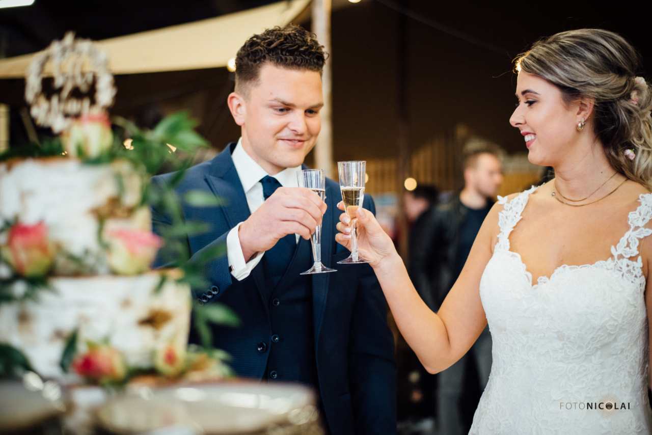 En dan is het natuurlijk tijd om te proosten met de heerlijke bubbels van Festifizz en de verrukkelijke bruidstaart aan te snijden! Alle bruidsparen konden een stukje proeven van de bruidstaart gemaakt door B’Elle.